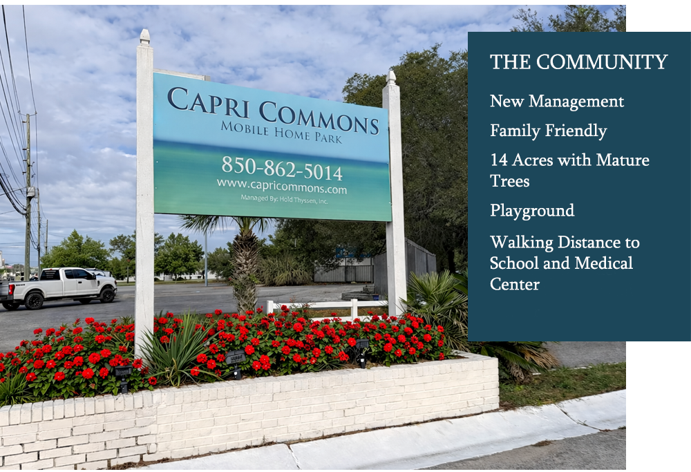 Capri Commons is a family-oriented, mobile home park and manufactured home community in Fort Walton Beach Florida with an on-site manager, washer & dryer facilities, club house, playground and public utilities. Our mobile home park is located in close proximity to top rated public schools and universities, medical centers, public golf courses, world class white sand beaches, excellent fishing, and many opportunities for sports and outdoor activities.